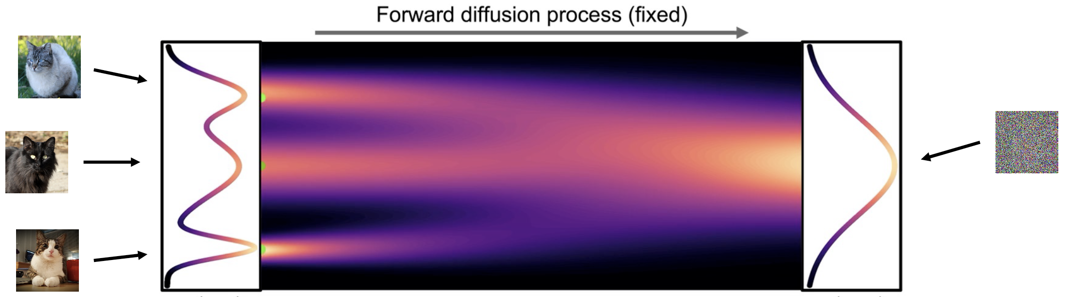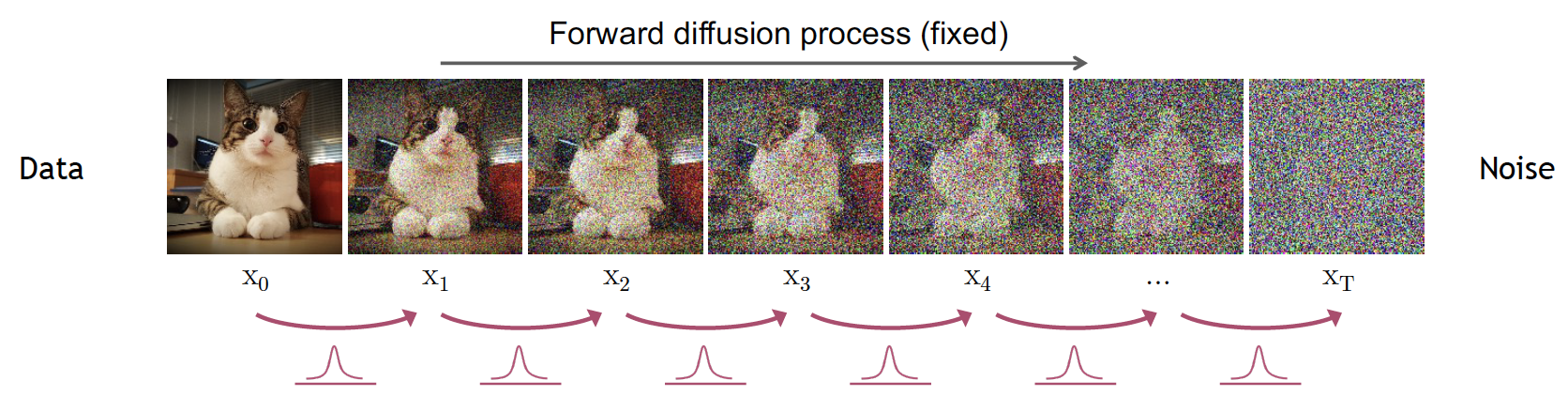 The process starts by slowly and iteratively add random noise to corrupt the data, such that it moves away from its original distribution. Noise is iteratively injected into the data following a schedule that controls the "amount". Adding noise for \(T\) steps leads the data to be unrecognizable and part of a different distribution, e.g. isotropic gaussian after iteratively adding gaussian noise.