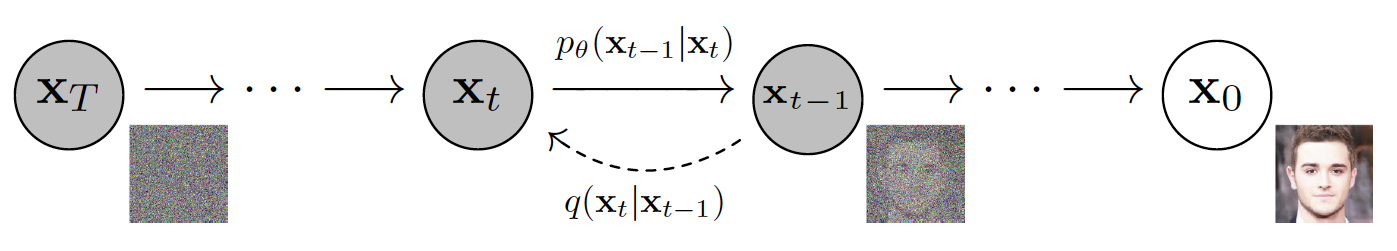 The reverse process is also modeled by a Markov chain. In it we attempt to reconstruct the input \(x_0\) from the corrupted noised image \(x_T\). For small \(\beta_t\) the reverse conditional \(q(x_{t-1}|x_t)\) is also a normal distribution.