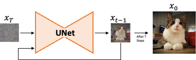 The goal is to recover the original distribution from the less complex and more tractable data distribution. This is achieved by iteratively applying a denoising model to the input corrupted data. At each step in reverse \(t\) the model predicts the denoised data \(x_{t-1}\) from input \(x_t\).